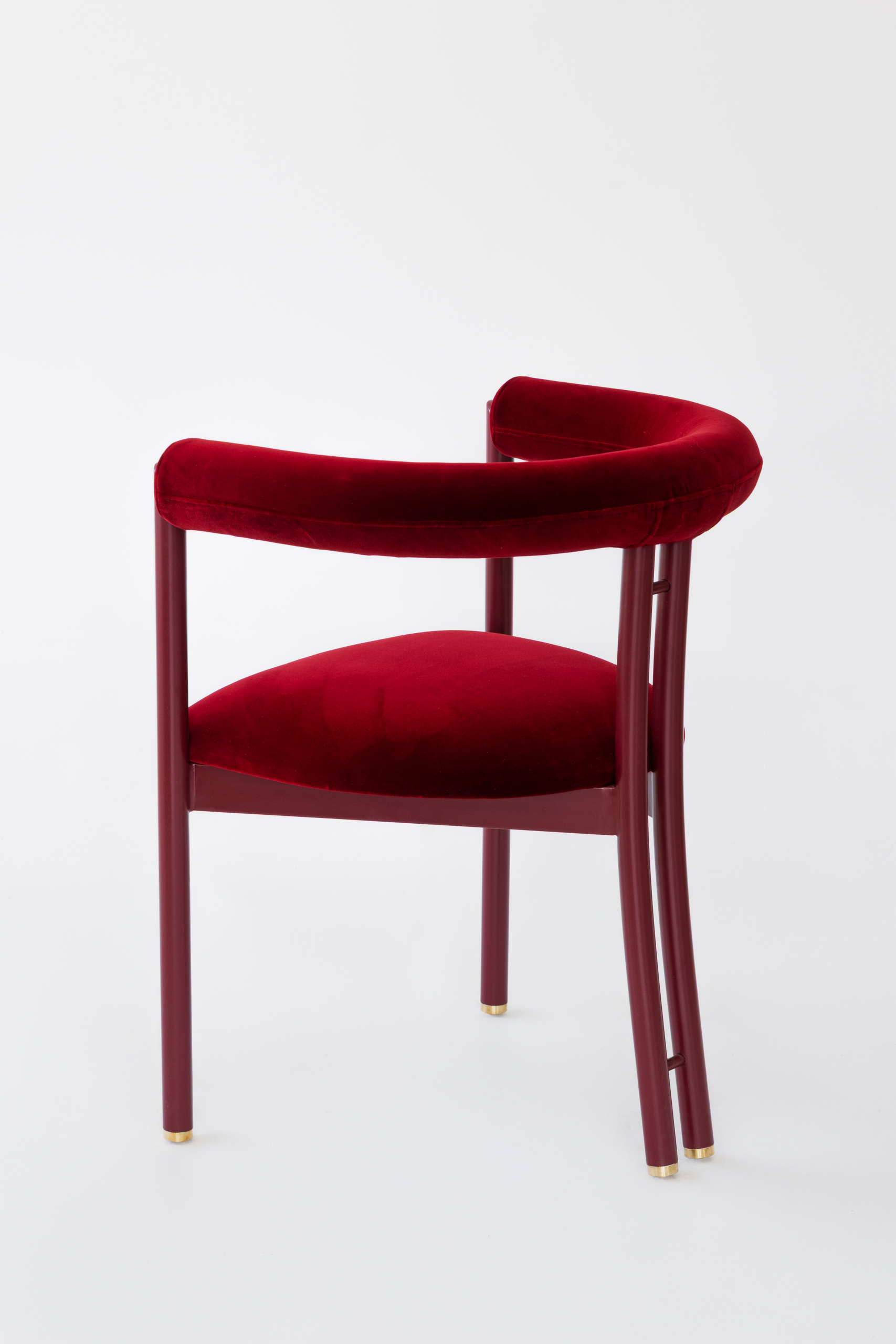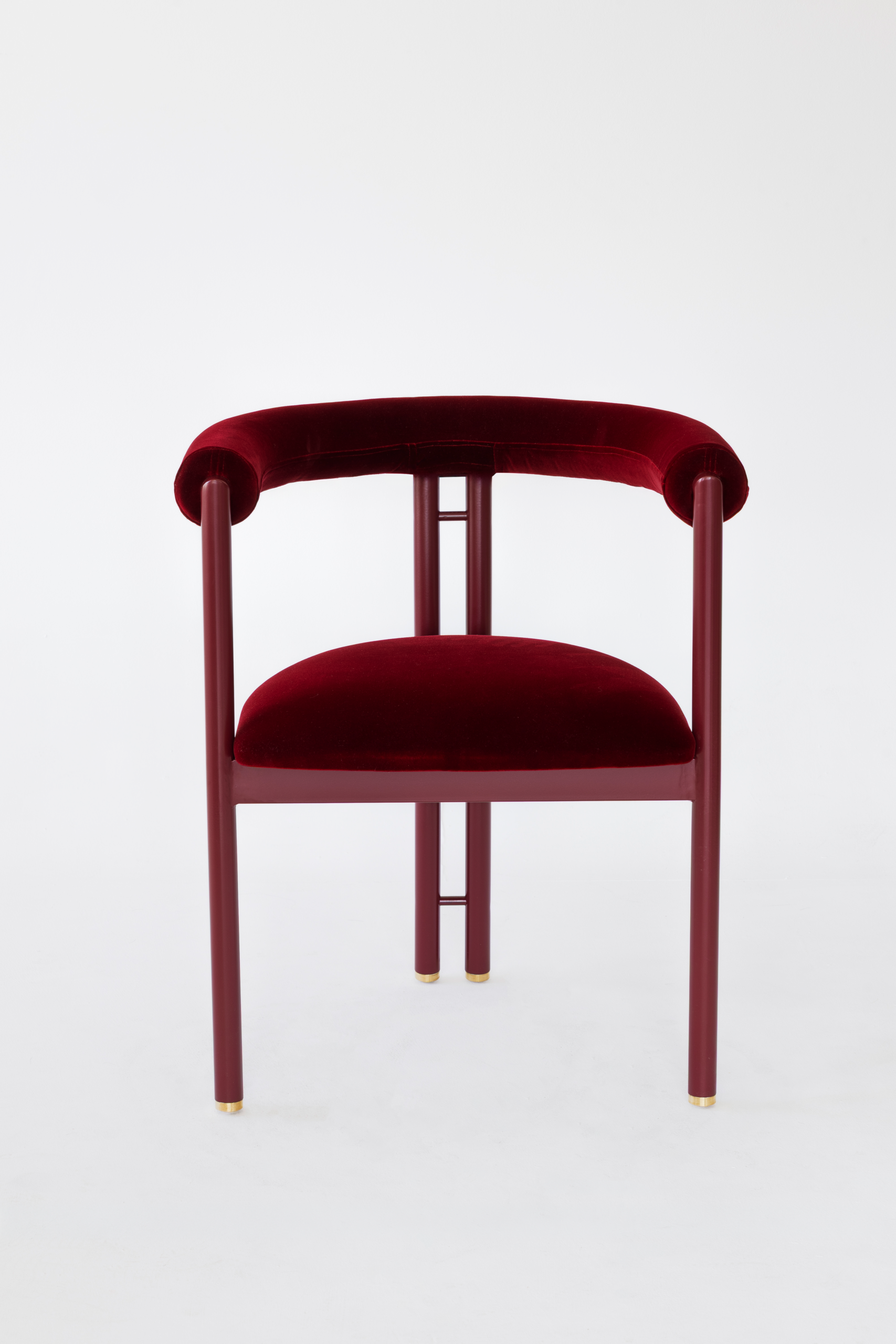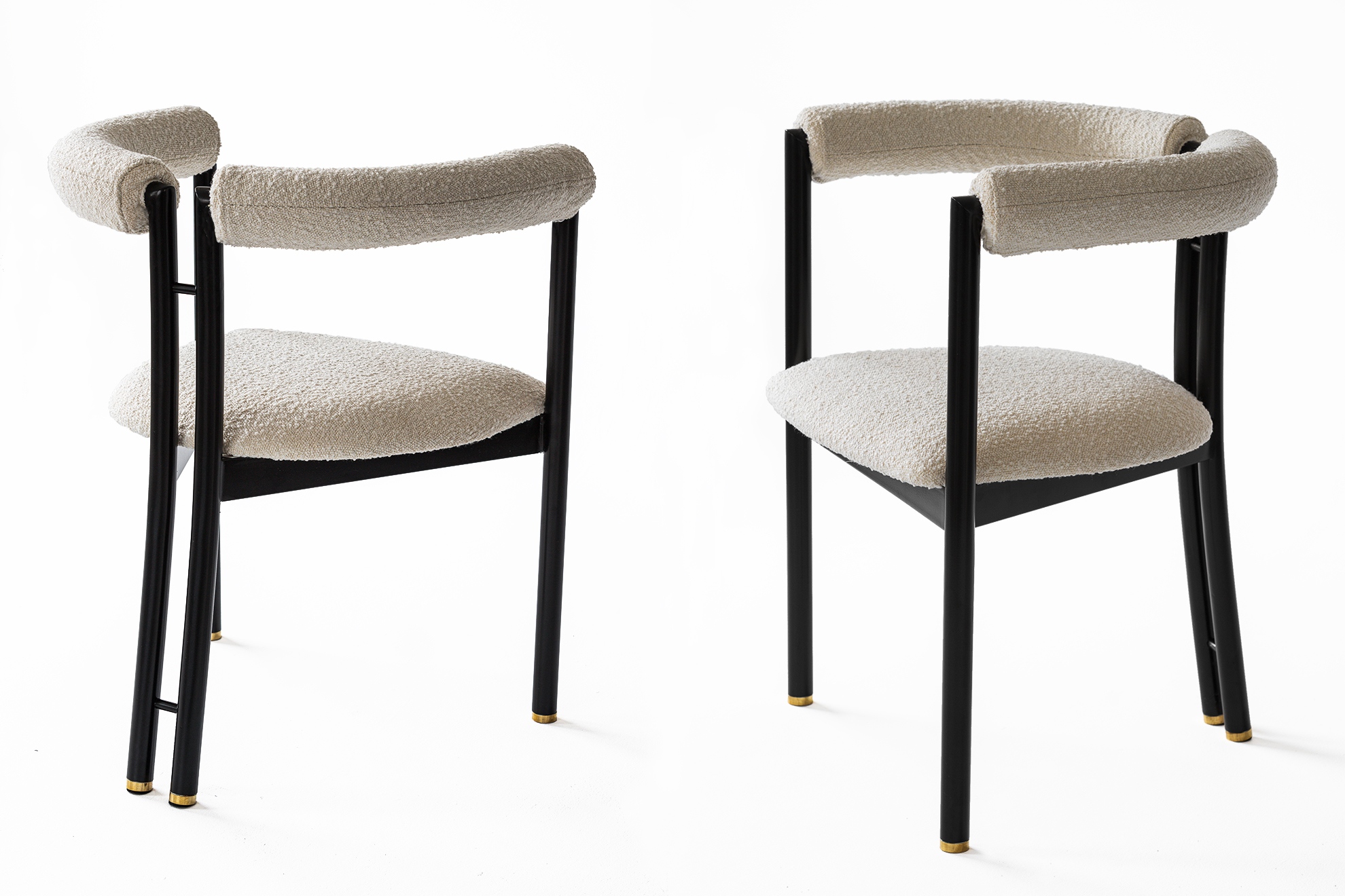 Chair with black metal base, brass details, seating with armrests.